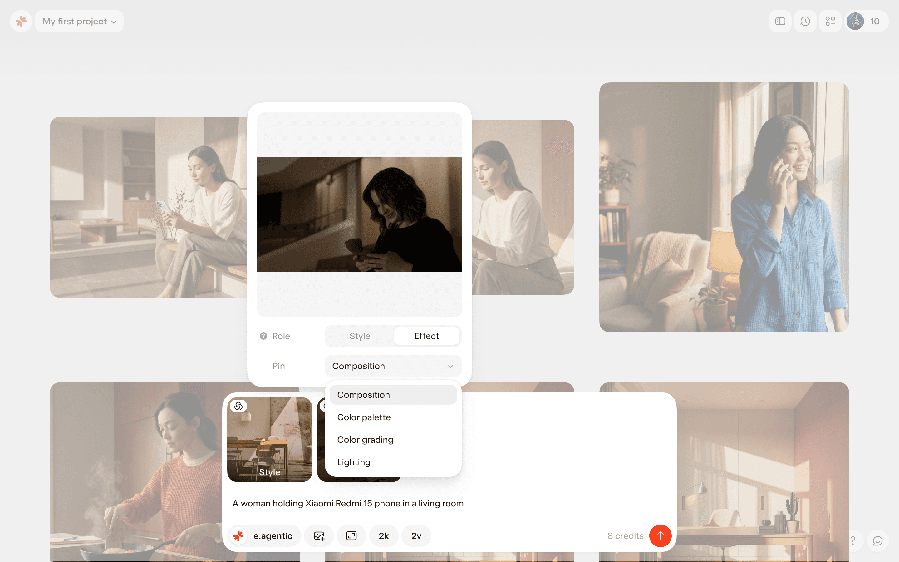 Effect transfers only a specific visual component. The AI extracts a single element such as composition, lighting, colour, or rendering while ignoring the rest of the image’s artistic style.