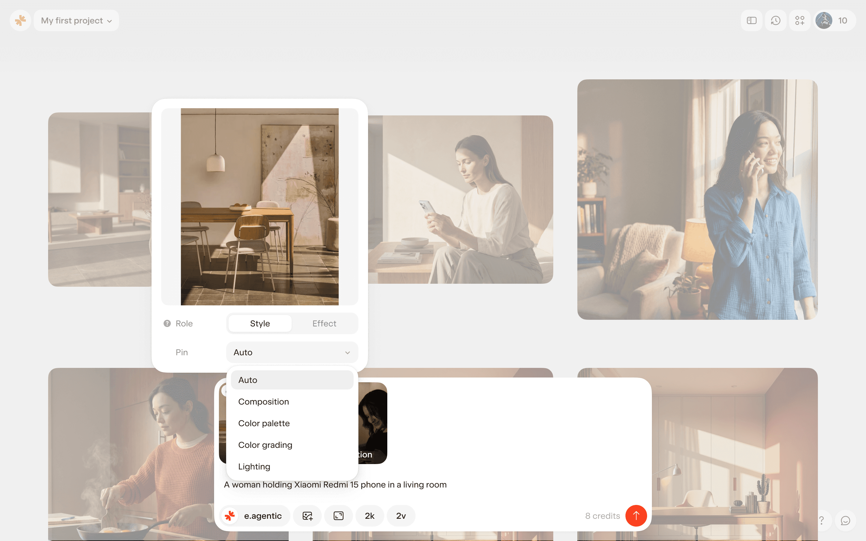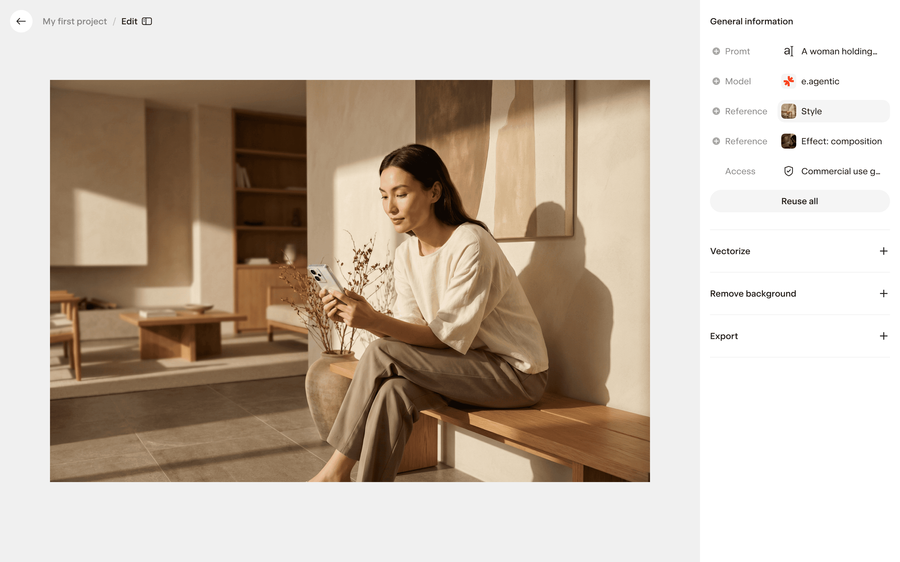 Exactly 1.0 Agentic is a style transfer agent in Exactly.ai that lets you generate images by extracting and combining style components from reference images. Instead of training a full model or collecting large datasets, you can reuse visual elements such as composition, lighting, or colour from existing images and apply them to new generations. This allows you to scale an existing style using a small number of references, create a new style by combining elements from different images, or edit images by adjusting individual style components.